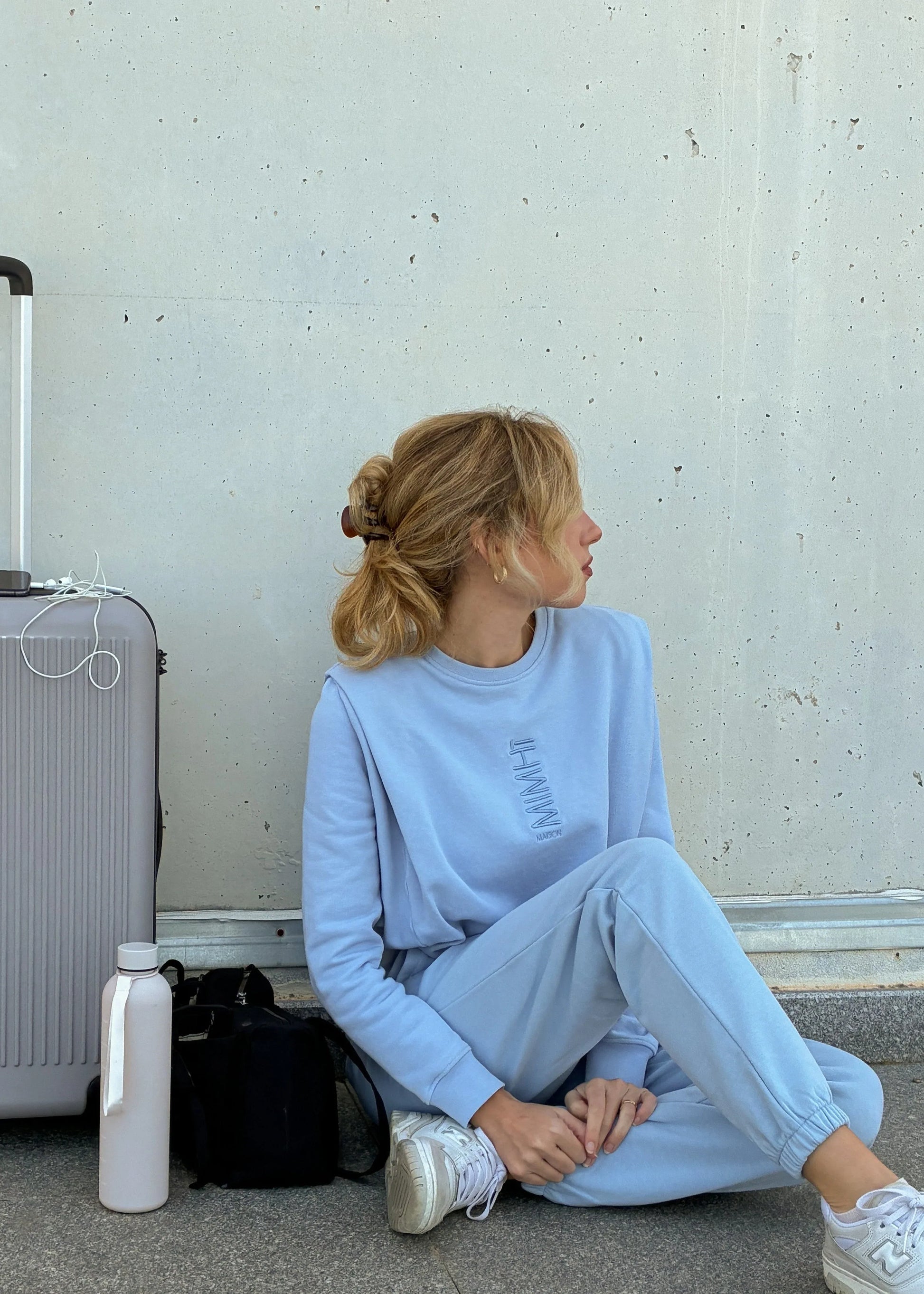 The Lauper set, crafted from high-quality brushed cotton, blends comfort with modern elegance through a thoughtfully detailed design. The sweatshirt features padded shoulders and front pleats that create a structured, sophisticated silhouette, while ribbed cuffs and hem and an embroidered logo add a refined finish.